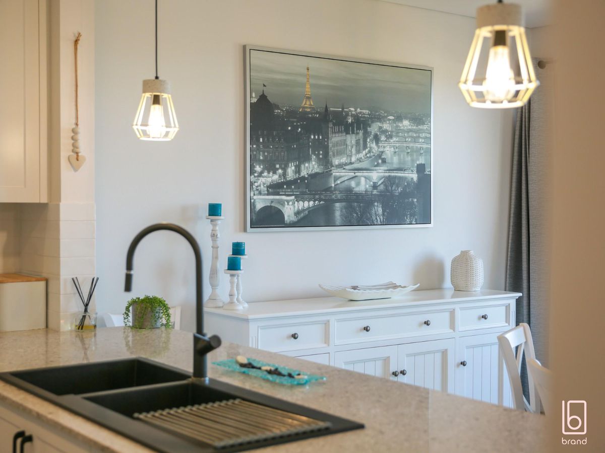 * Designer kitchen with stone benchtops, black sink and tapware, Bosch cooktop, and dishwasher